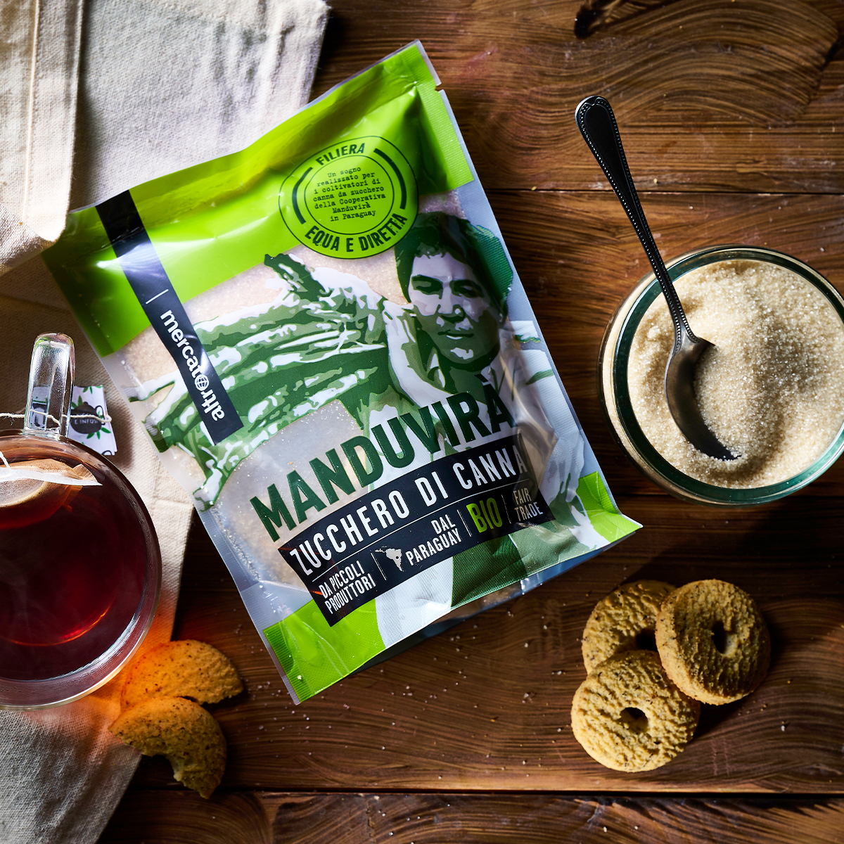 Zucchero biologico grezzo del Paraguay con cristalli di grandi dimensioni di colore ambrato in cui la melassa viene separata attraverso processi fisici (centrifugazione e lavaggio dei cristalli con acqua calda) senza l’utilizzo di agenti chimici. Viene coltivato senza abbattere foreste vergini, con il solo utilizzo di acqua piovana e lavorato in impianti che utilizzano gli scarti di produzione per realizzare energia a basso impatto ambientale. Uno zucchero delicato e versatile, che ha reso indipendenti i contadini di Manduvirà.